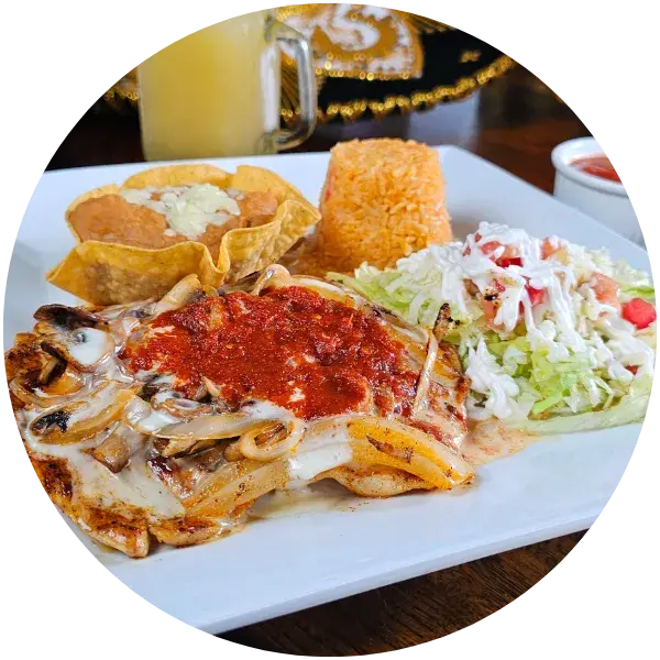 Char-grilled chicken breast topped with cheese and salsa ranchera. Served with rice, beans, and guacamole salad.